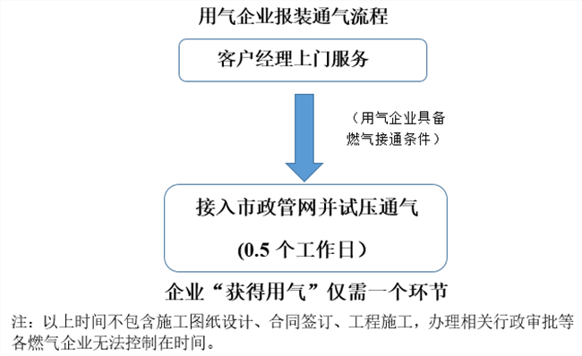 凡是燃?xì)夤芫W(wǎng)輻射區(qū)域內(nèi)的用戶,“獲得用氣”僅需1個(gè)環(huán)節(jié):即“接入通氣”,共需0.5個(gè)自然日,申請(qǐng)報(bào)裝“零成本”。